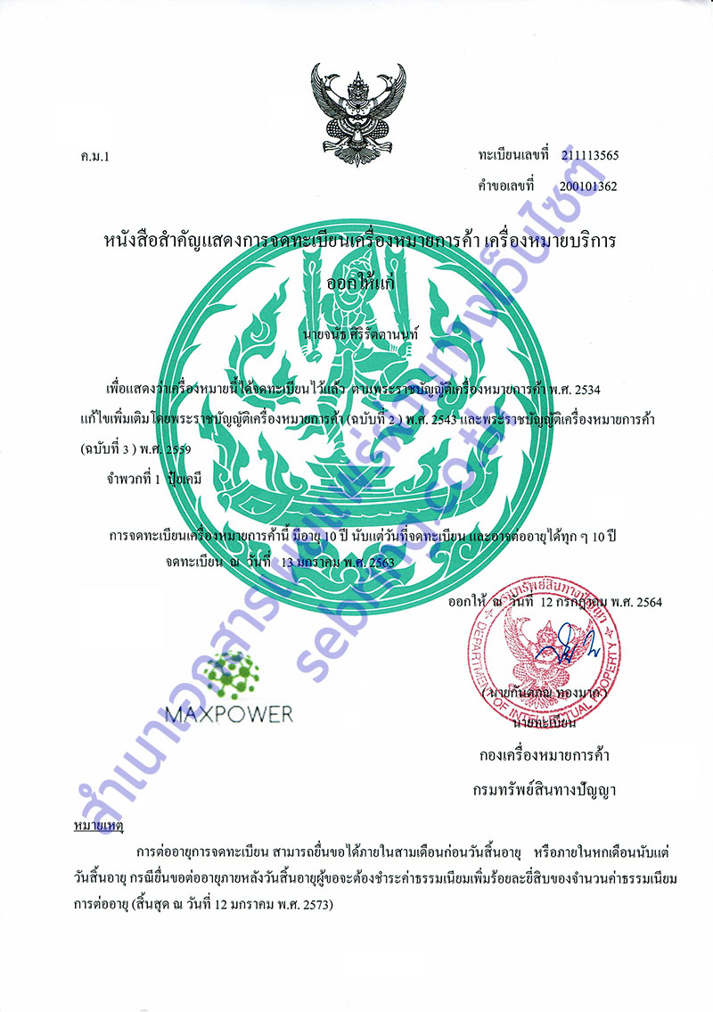 หนังสือสำคัญแสดงการจดทะเบียนเครื่องหมายการค้า เครื่องหมายบริการ