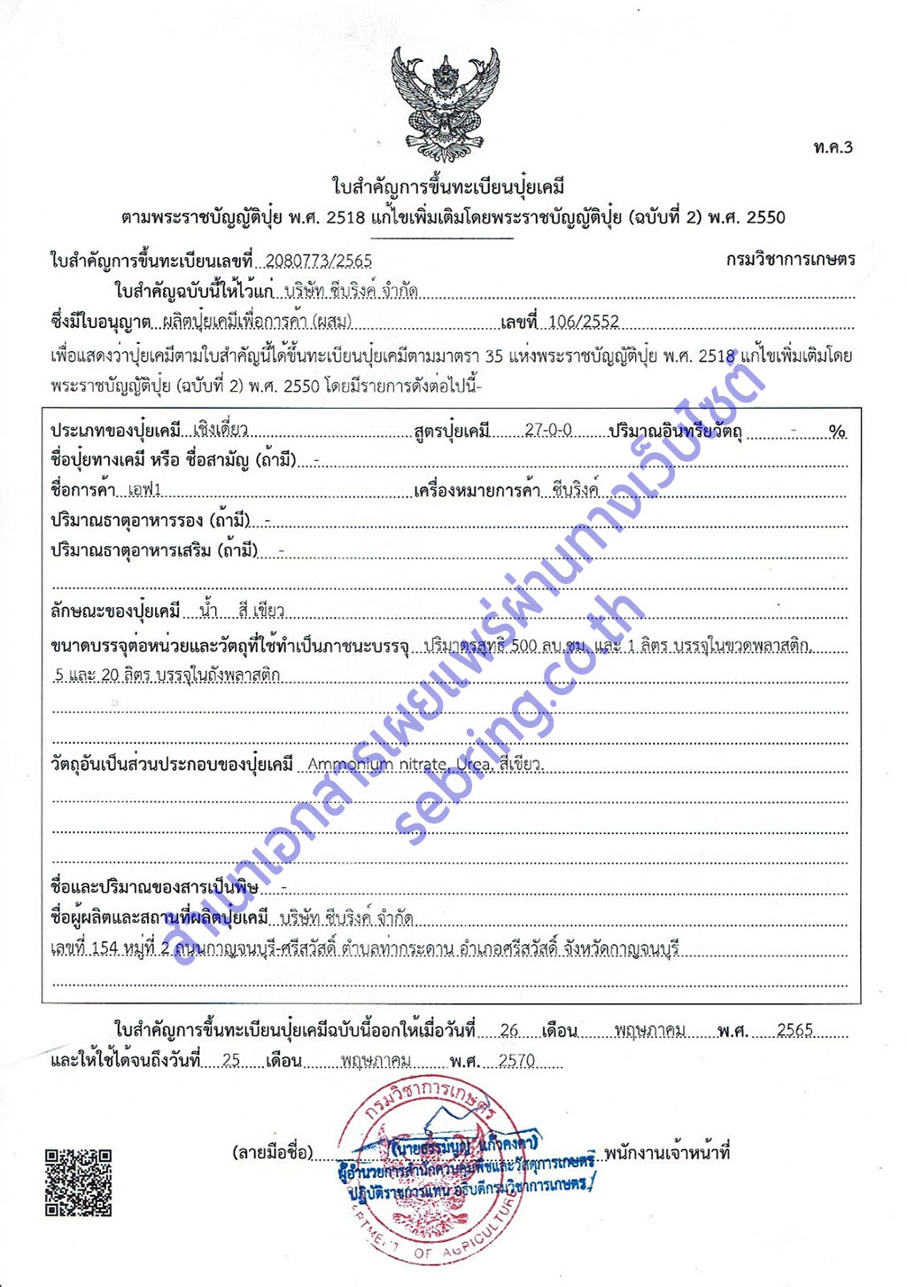 ใบสำคัญขึ้นทะเบียนปุ๋ยเคมี ท.ค.3 – เอฟ1